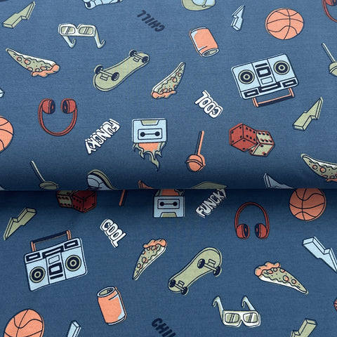 Carreaux bleu et fleurs - Coton ouaté extensible imprimé