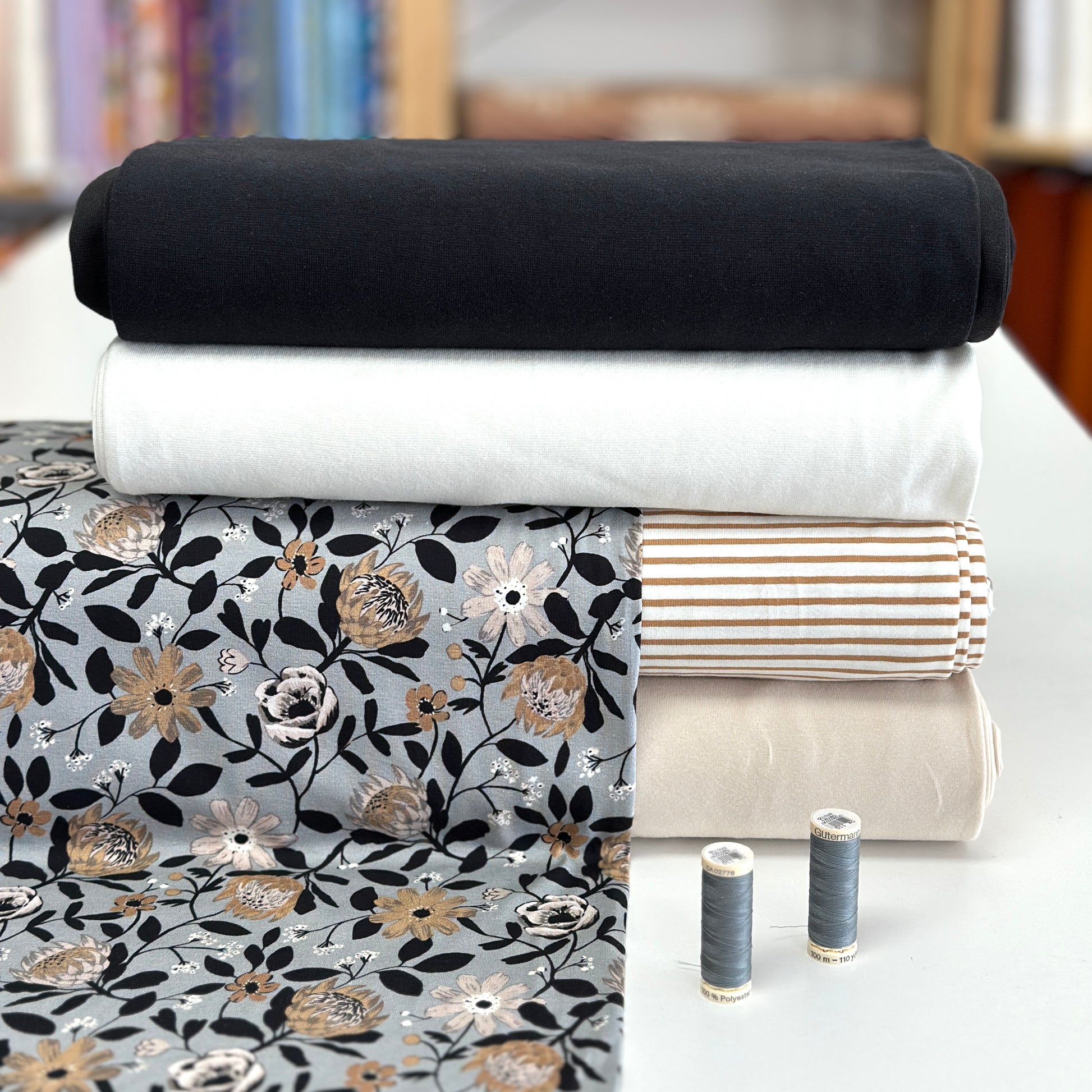 Jersey: Dusty green, Ecru, Sahara, Ochre