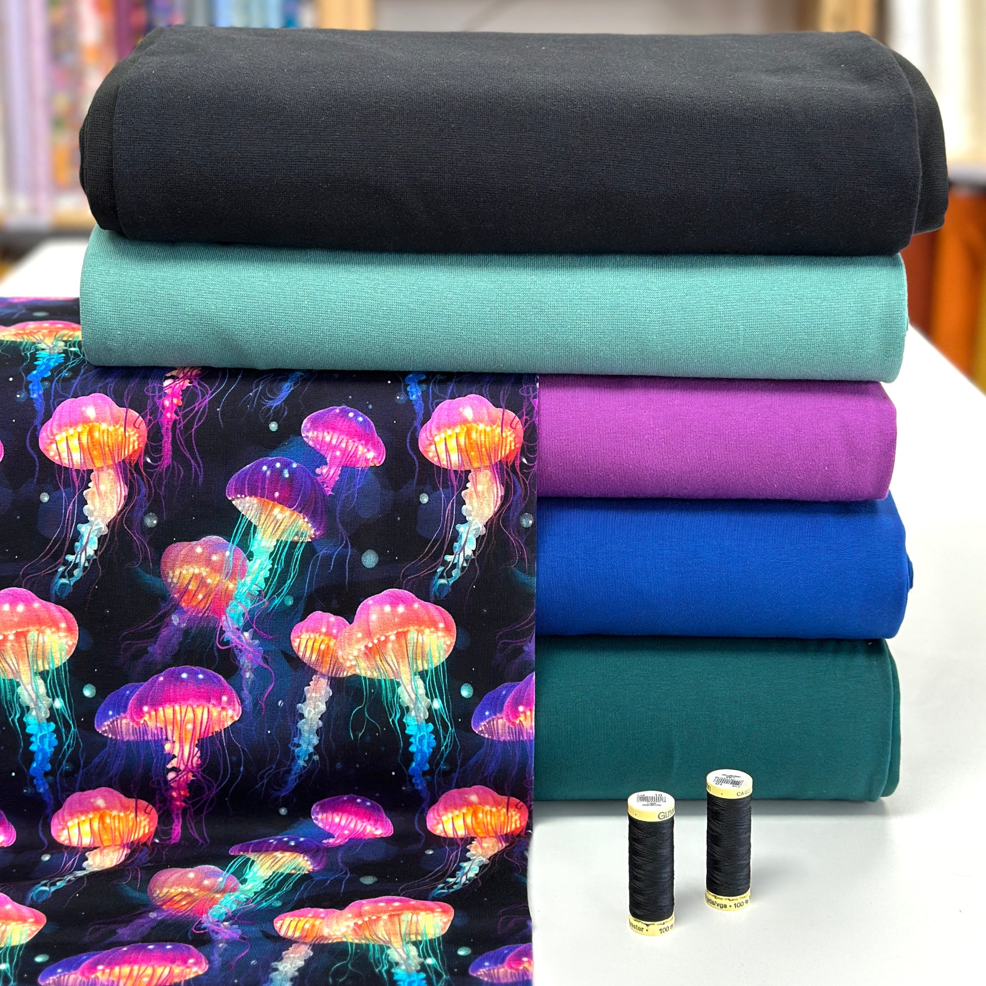 Premium printed jersey, Oeko-Tex certified. 4-way stretch, perfect for making adjustable pants, hoodies, sweaters, dresses, etc. Join us on Facebook for inspiration!