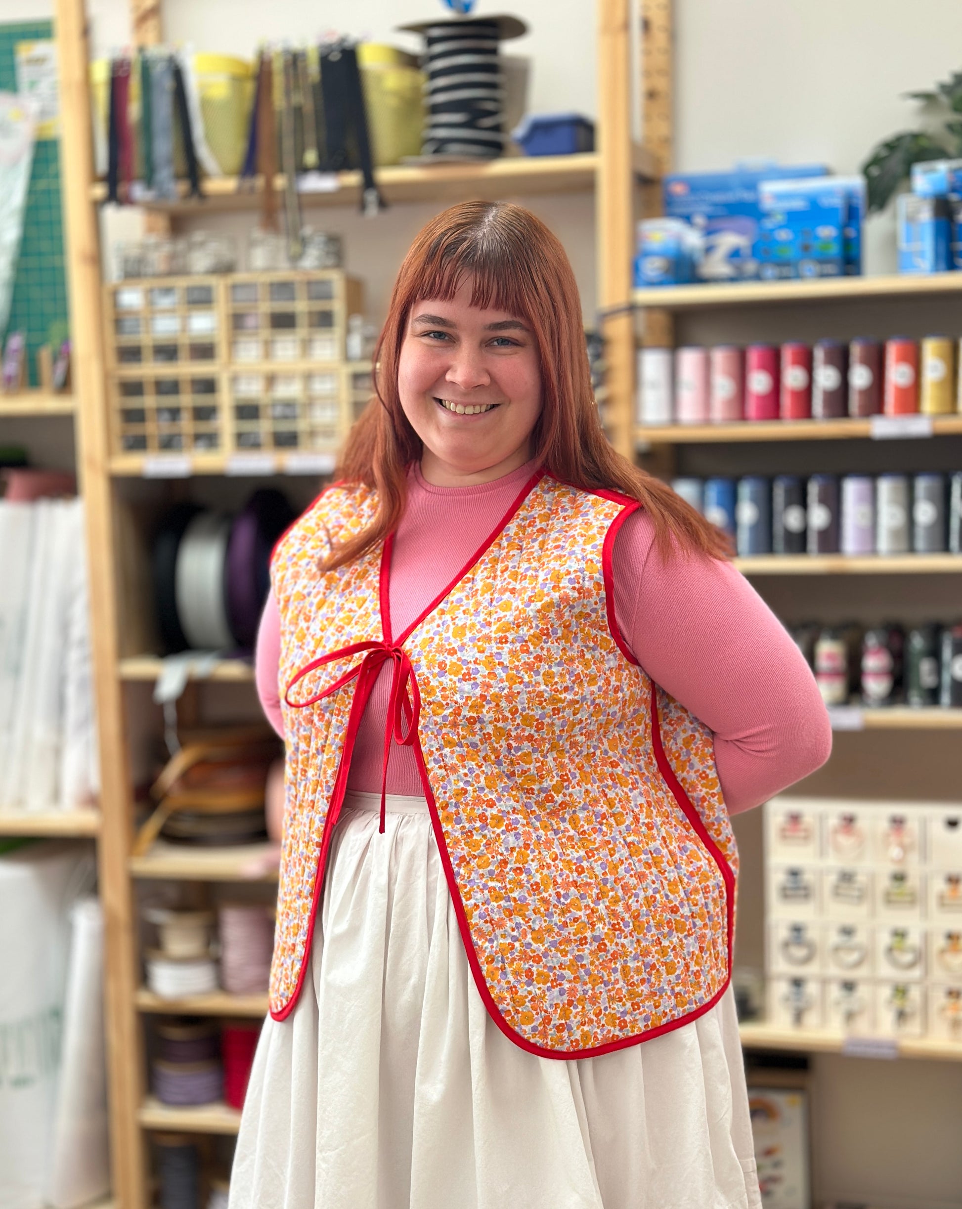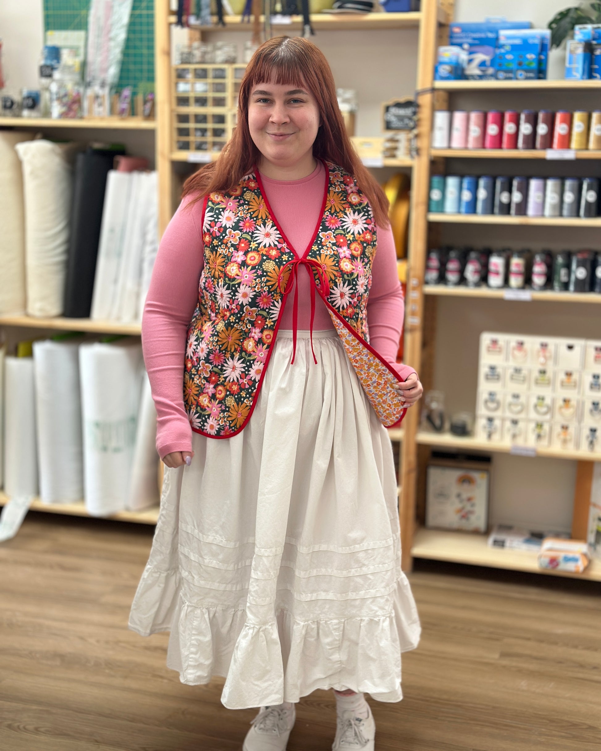 Le patron MARJOLAINE pour adultes deviendra rapidement un incontournable de votre garde-robe ! Cette veste sans manches est entièrement réversible, et ses deux côtés conservent un aspect propre et joliment fini. C’est le patron parfait pour mettre en valeur un tissu réversible, comme du coton ou de la mousseline matelassée à motifs. La boucle au centre ajoute une touche de féminité et offre la possibilité de porter la veste fermée. Le MARJOLAINE est idéal à superposer sur un chandail près du corps, comme notre CIBOULETTE, durant les saisons plus fraîches.