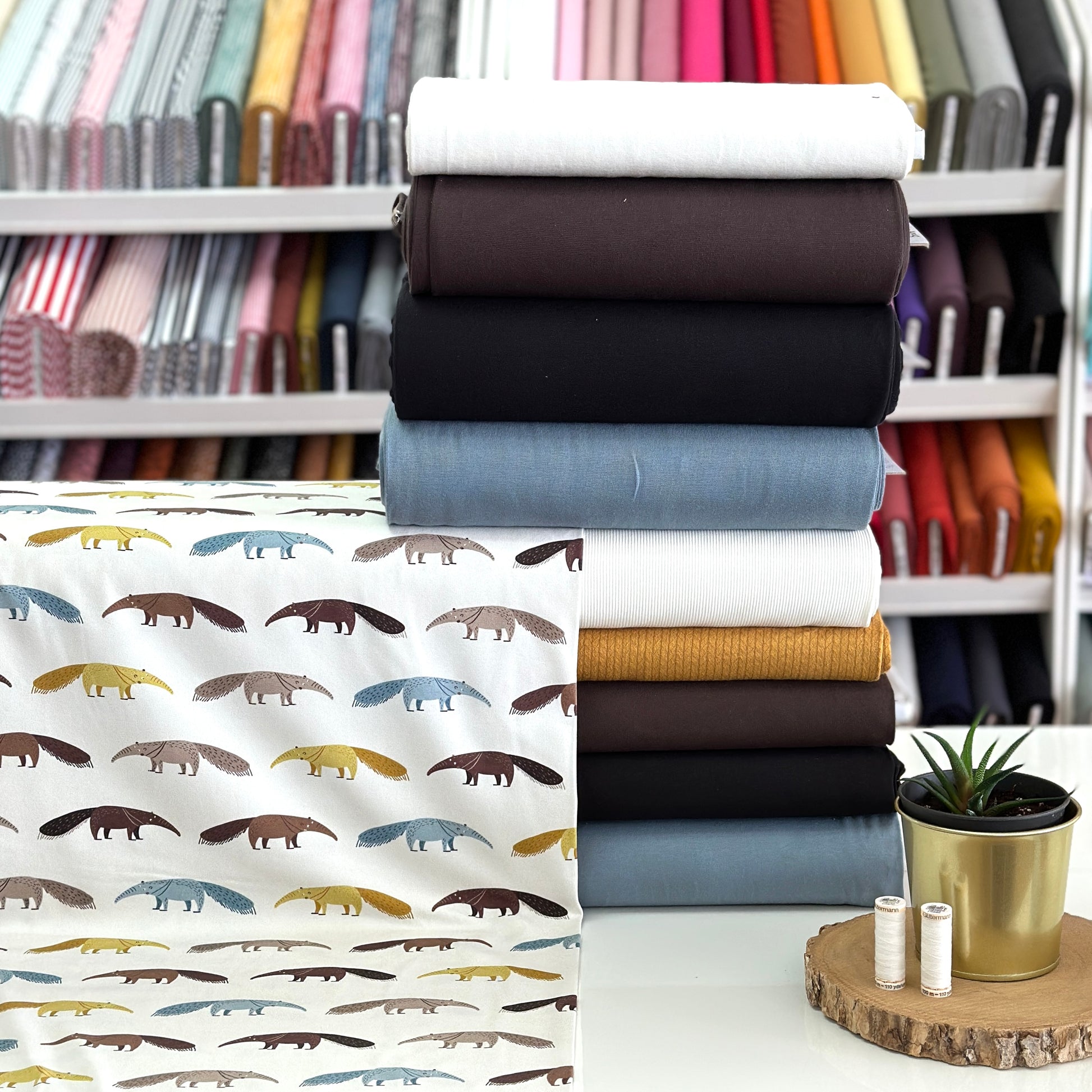 Jersey : Bleu poussière, Noir, Brun, Tricot recyclé moutarde, Jersey côtelé Écru