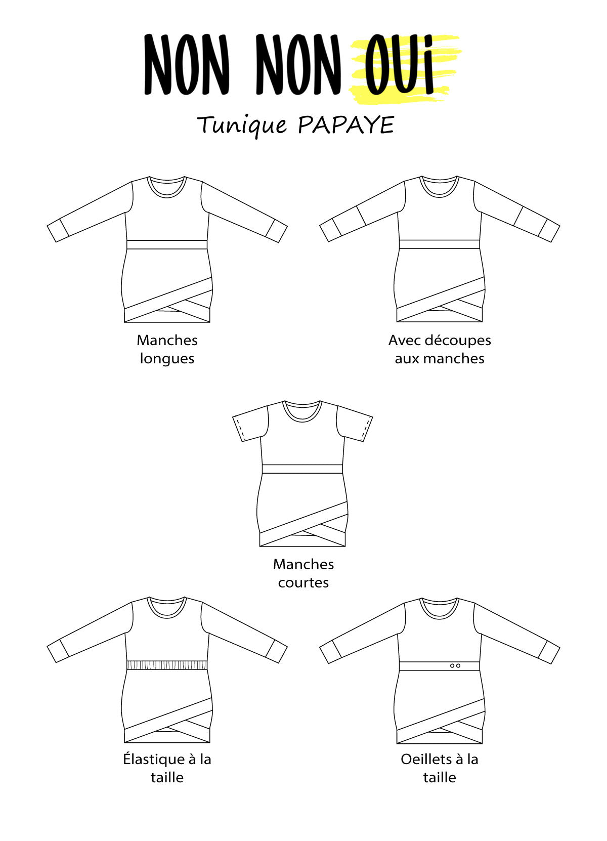 La tunique Papaye offre plusieurs possibilités de versions différentes, permettant de laisser aller votre créativité ! Vous pouvez concevoir une tunique à manches courtes ou à manches longues, avec empiècements aux manches ou non et avec œillets ou avec taille élastique.
